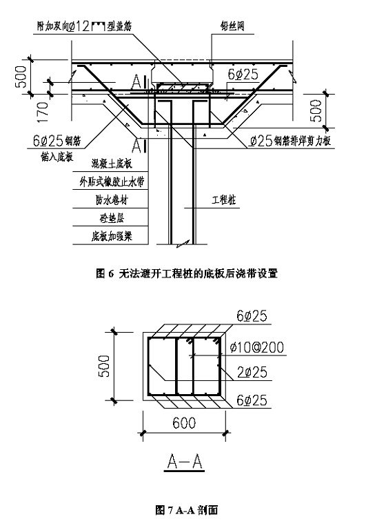 為保證橡膠止水帶的連續性,將無法避開的工程樁進行下沉式處理,下沉高度為500mm。同時設置一道底板加強梁,以保證無法避開的工程樁與結構底板的連接。在加強梁中后澆帶位置處設置兩排φ25 鋼筋排焊剪力板,使加強梁后澆帶位置的混凝土能與底板后澆帶共同作用。如圖6、圖7 所示。